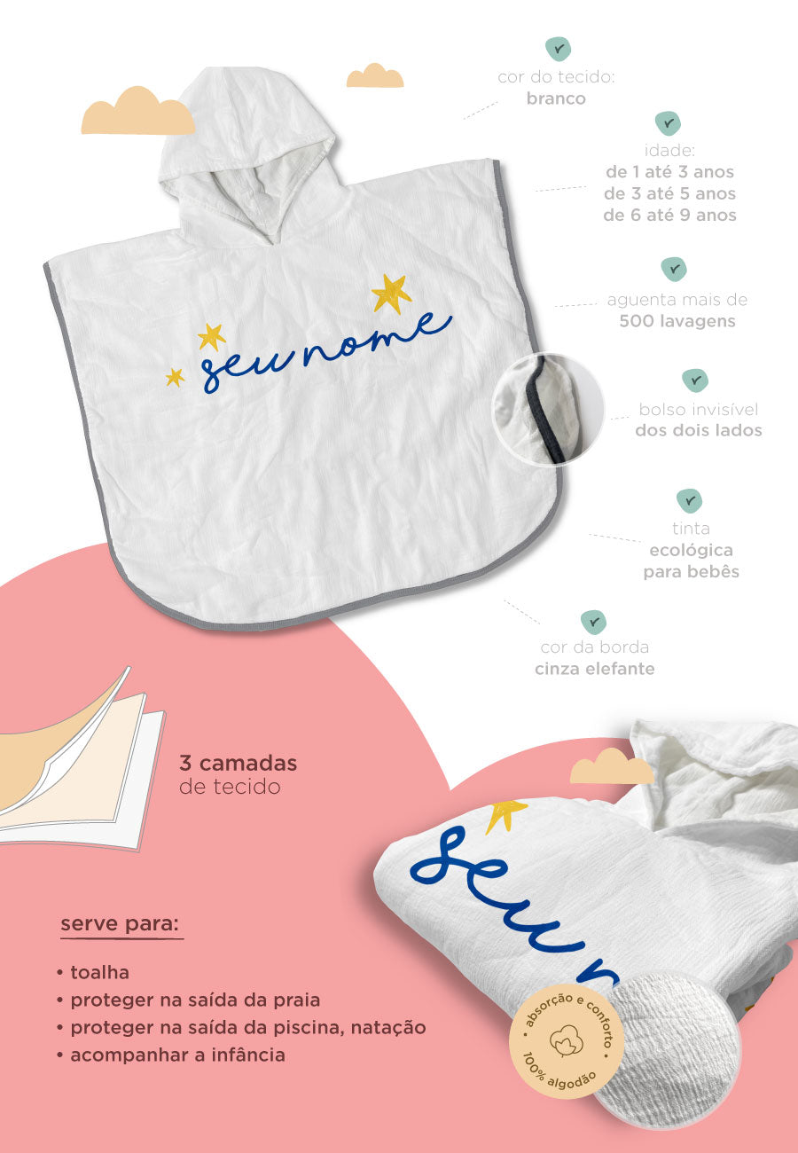3 camadas de algodão que servem para: enxugar e proteger na saída da praia, natação ou piscina.